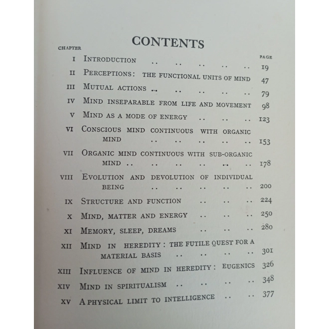 The book is described as "Demonstrating that mind is coeval with, and inseparable from, matter and energy. With special reference to matter in heredity, mental therapeutics, the immediate nature of psychic phenomena in spiritualism, and to a possible physical limit to human intelligence